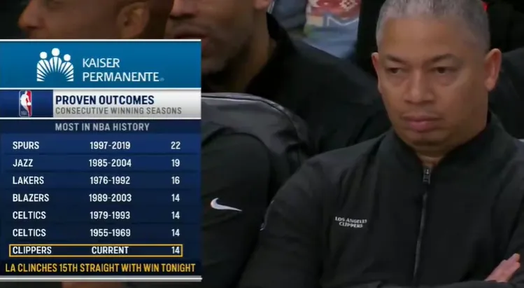 转播镜头晒出数据:快船连续15个赛季胜率达到50*以上,高居历史第四位。